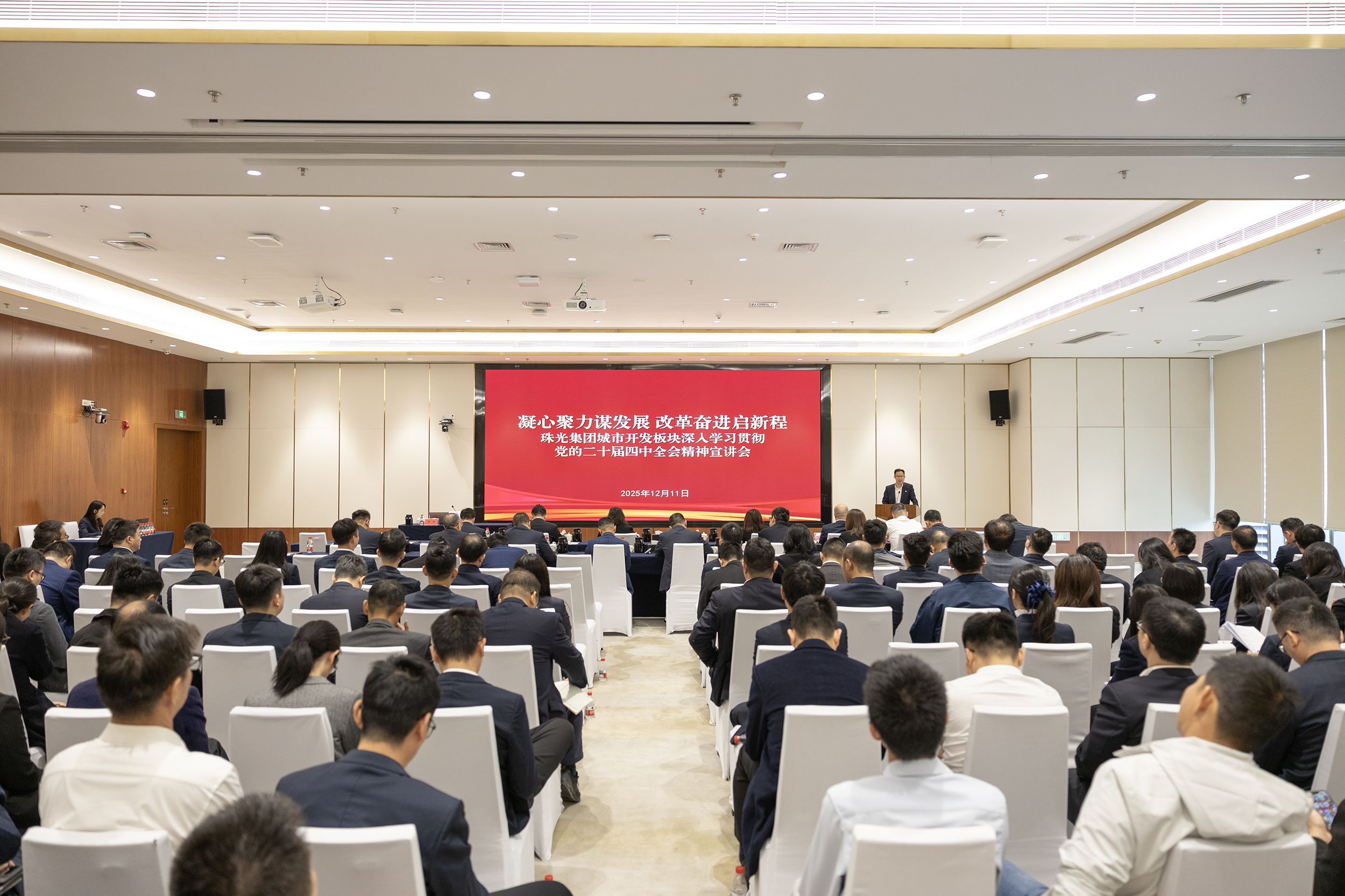 12月11日,珠光集團(tuán)城市開發(fā)板塊以“凝心聚力謀發(fā)展,改革奮進(jìn)啟新程”為主題,舉辦學(xué)習(xí)貫徹黨的二十屆四中全會(huì)精神宣講會(huì)。珠光城開集團(tuán)、大橫琴股份董事長(zhǎng)李鵬出席會(huì)議并講話,珠光城開集團(tuán)副總經(jīng)理練建平主持會(huì)議。